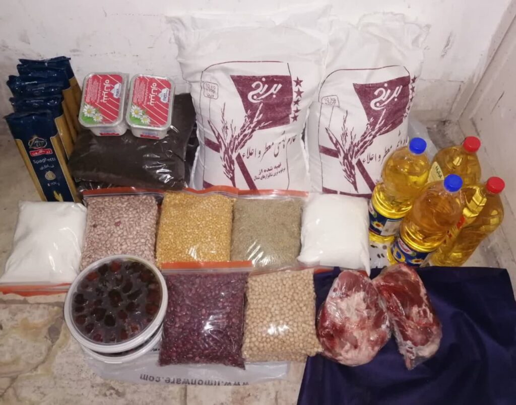این بسته های غذایی شامل گوشت، روغن، برنج، زعفران، شیره انگور، خرما بود که با مشارکت مالی بشری و کمیته امداد تهیه شد.